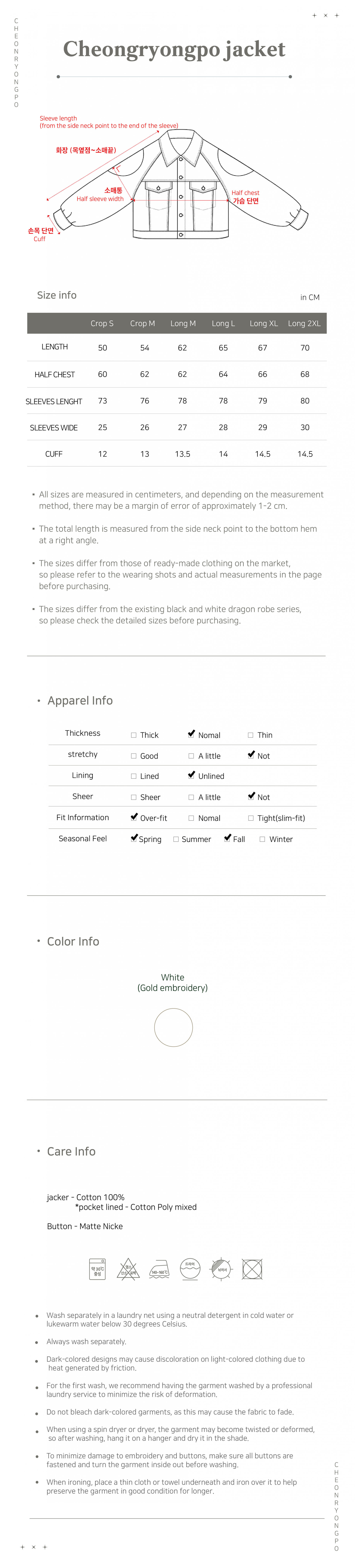 The Cheongryongpo Series Jacket is offered in one standard size, regardless of color.
