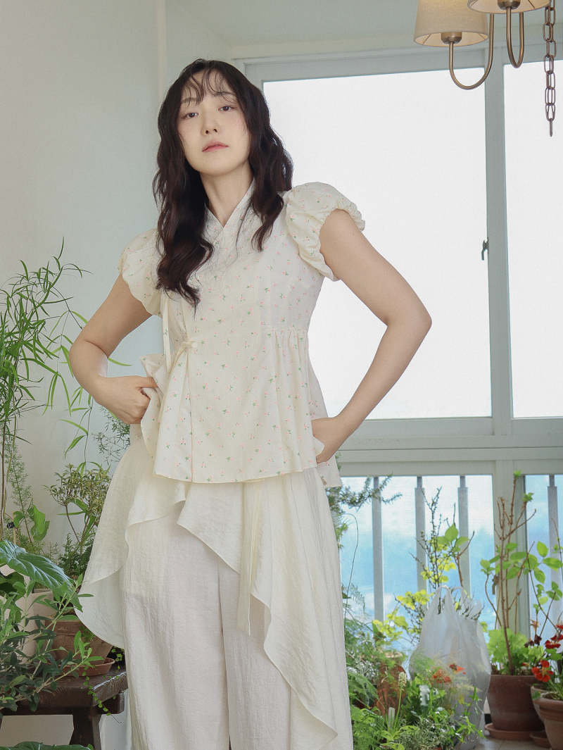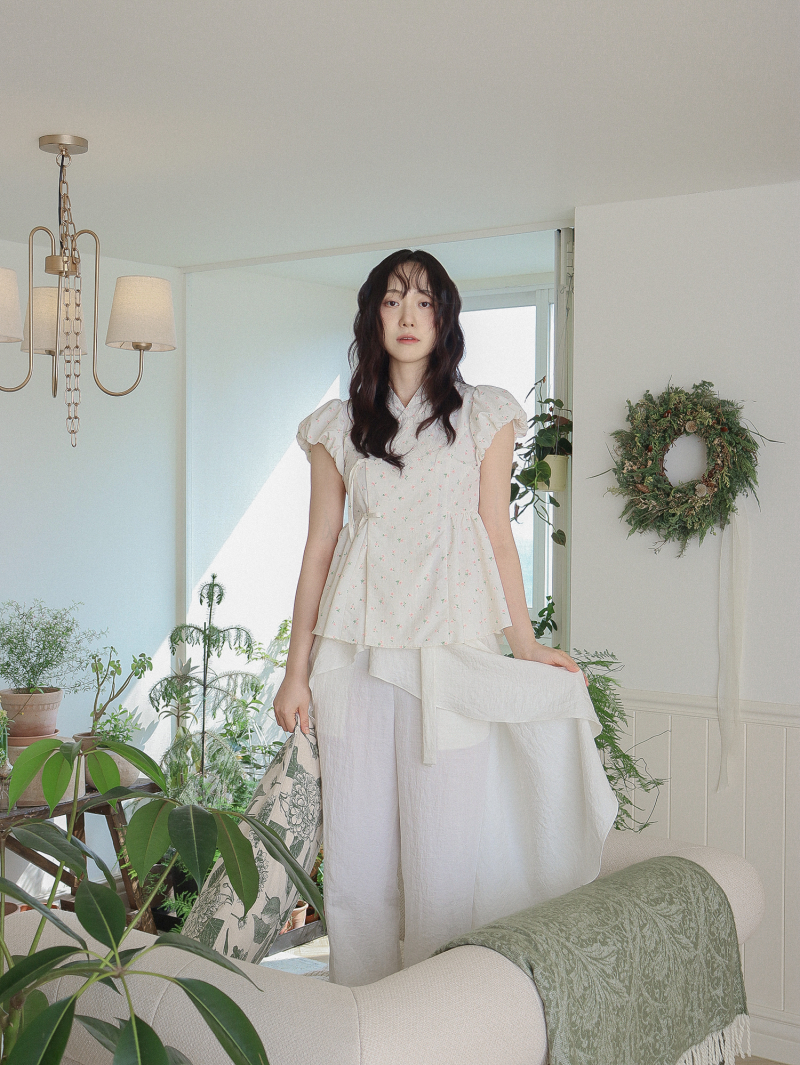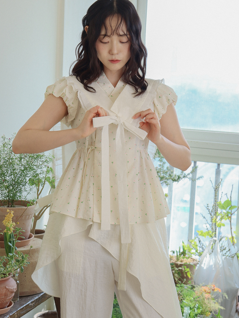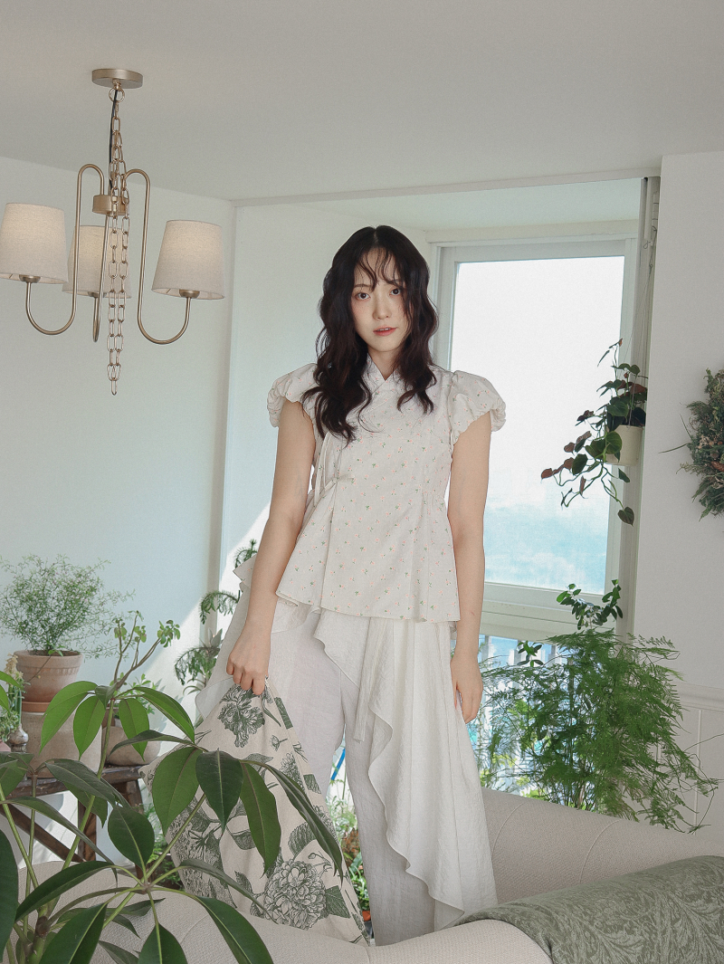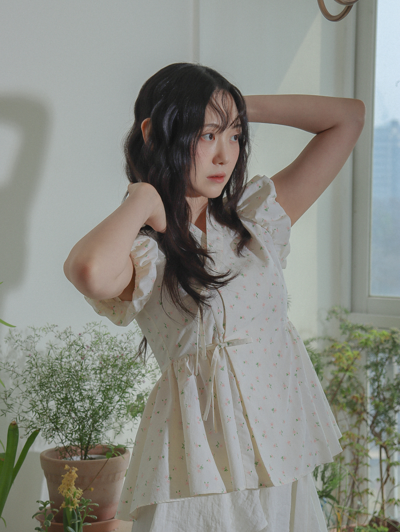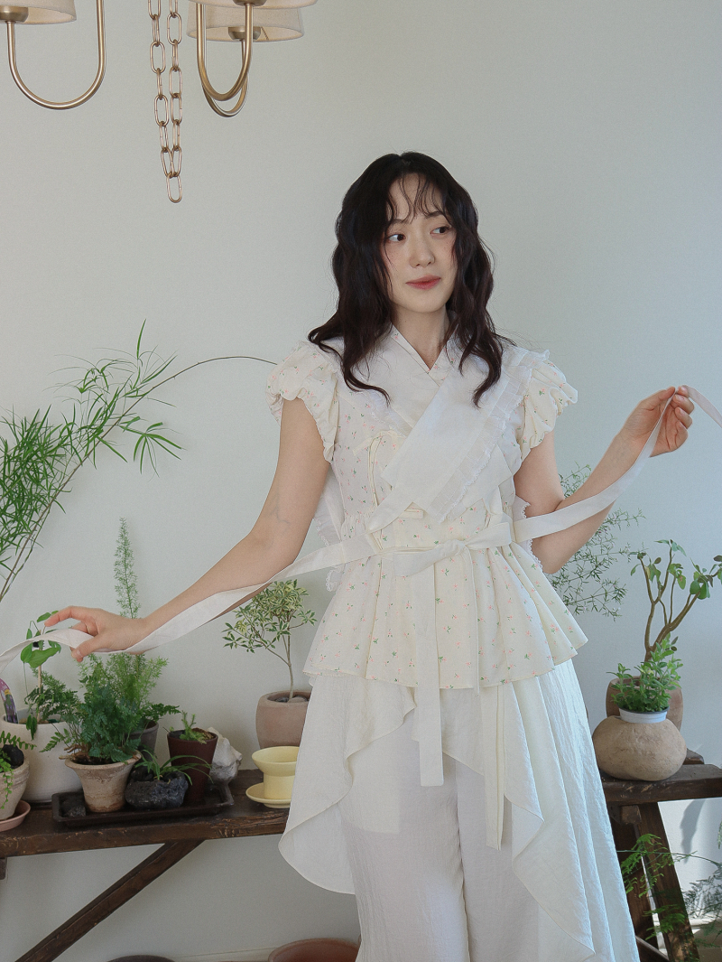 Model is wearing a Soso Jeogori Ditsy floral (Floral&Ivory) in size S