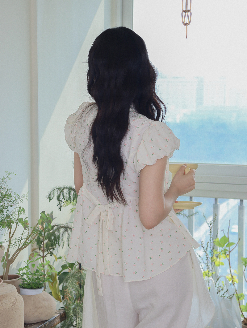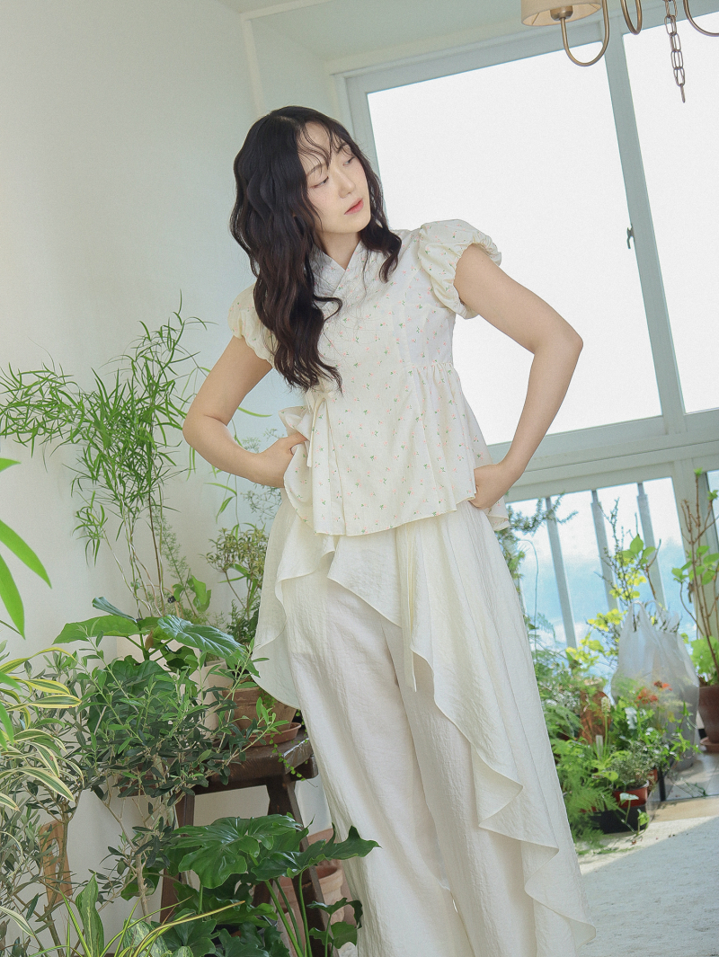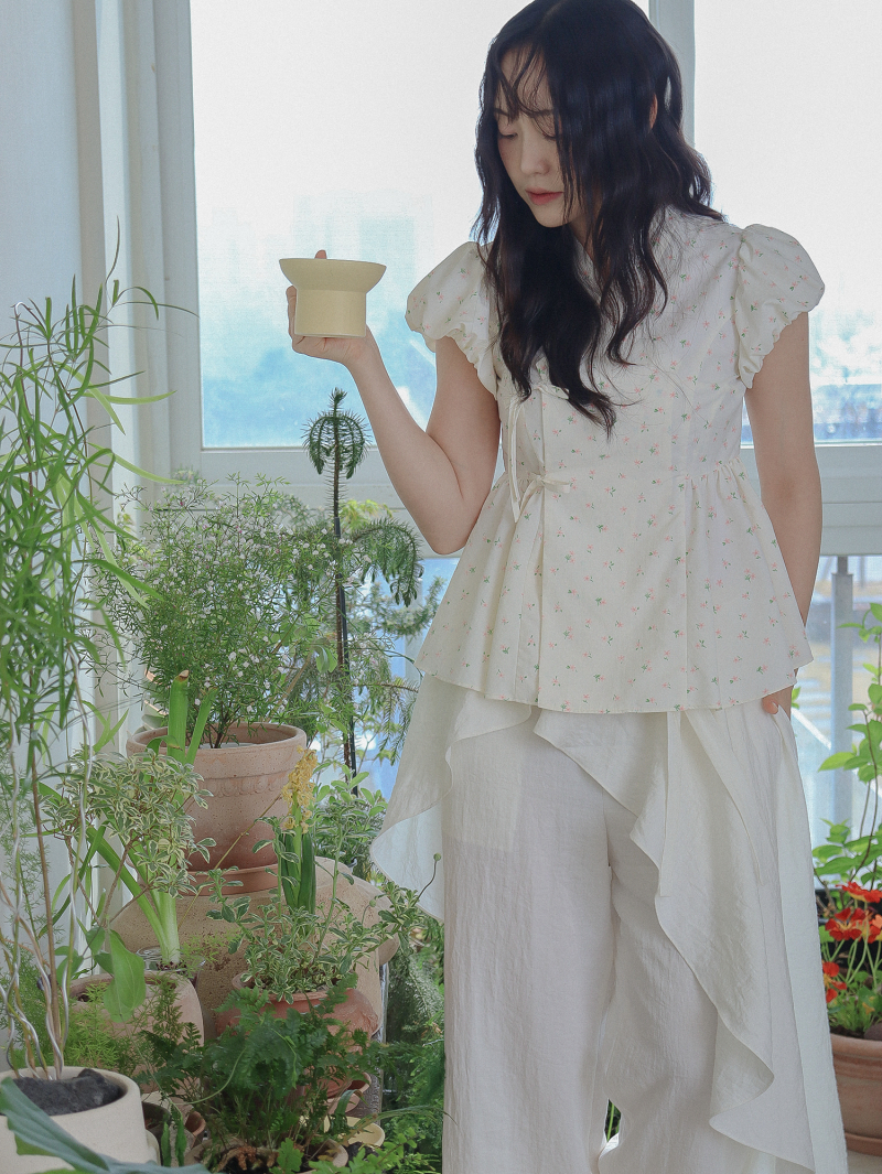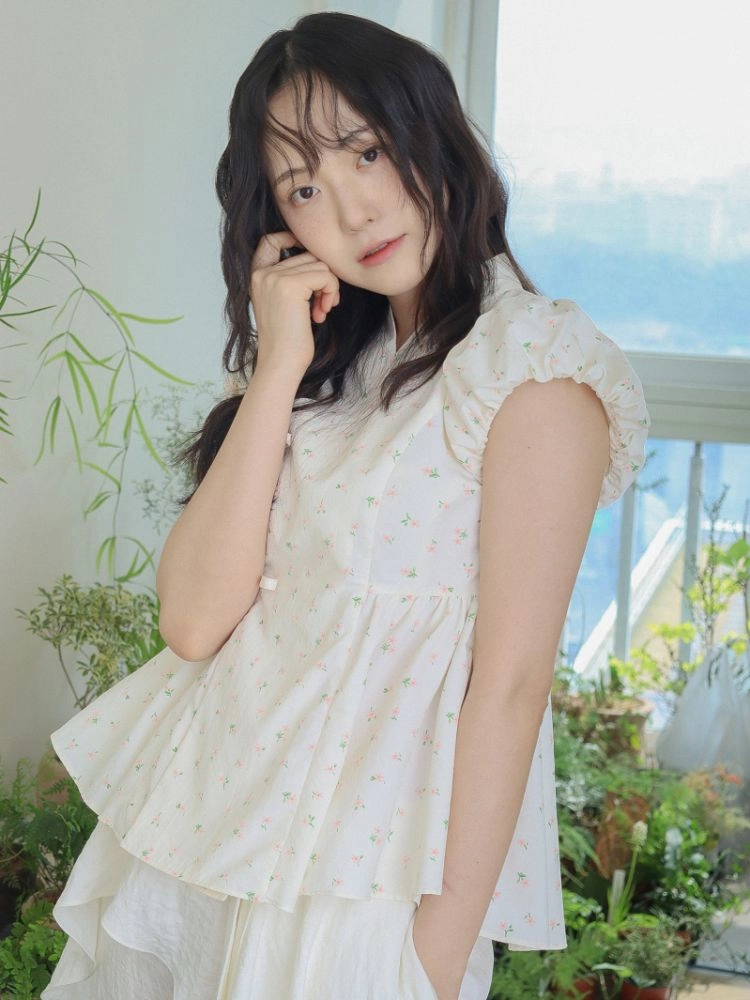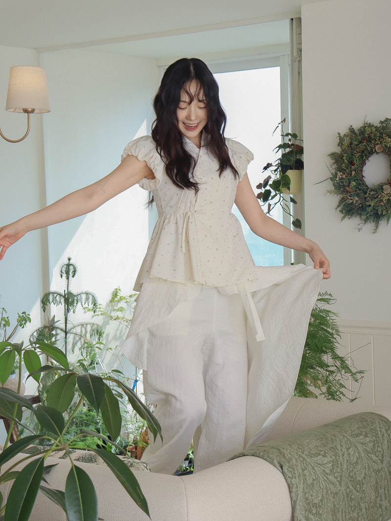 Model is wearing a Soso Jeogori Ditsy floral (Floral&Ivory) in size S