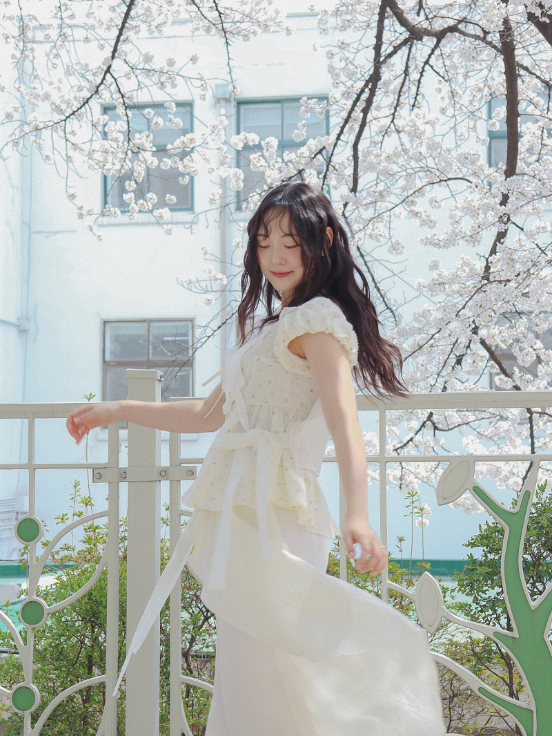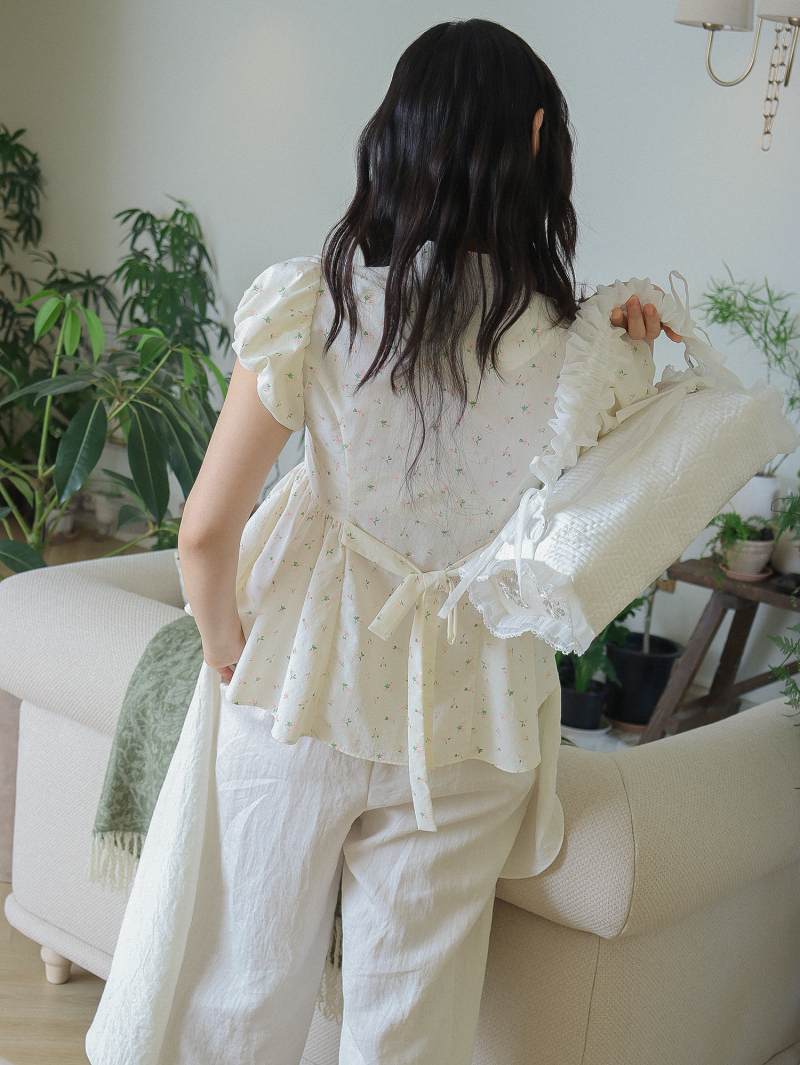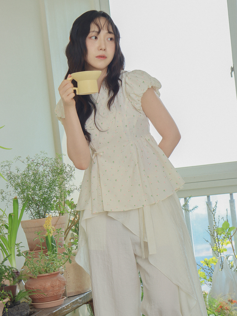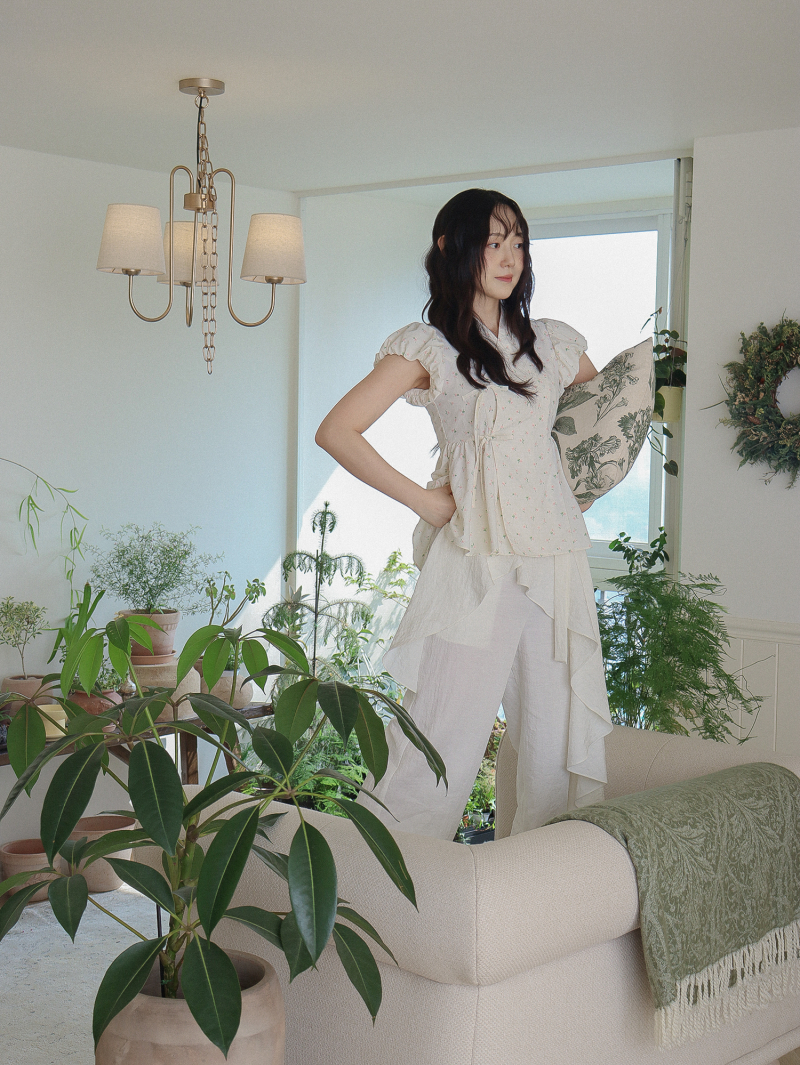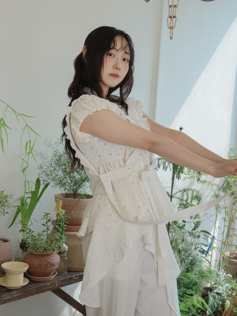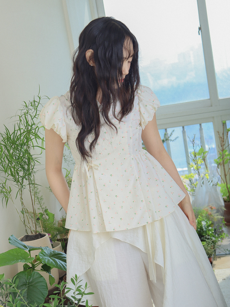 Model is wearing a Soso Jeogori Ditsy floral (Floral&Ivory) in size S